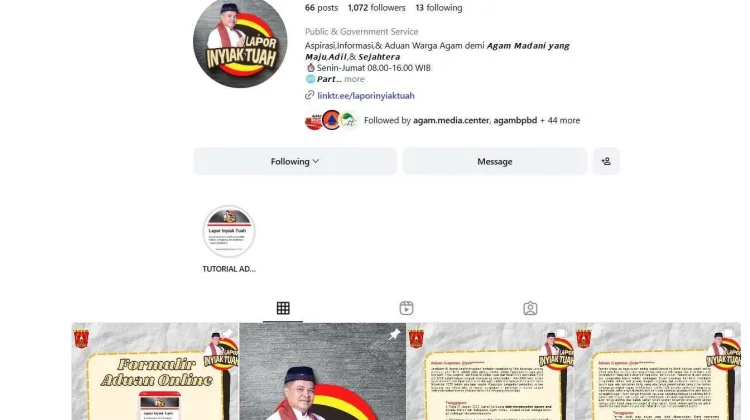 RRI.CO.ID, AGAM - Pemerintah Kabupaten Agam terus meningkatkan kualitas pelayanan publik melalui kanal pengaduan digital Lapor Inyiak Tuah sebagai bagian dari Program Unggulan Agam Melayani untuk mewujudkan visi “Agam Madani yang Maju, Adil, dan Sejahtera” serta misi tata pemerintahan yang transparan, akuntabel, dan berorientasi pada pelayanan publik berkualitas.