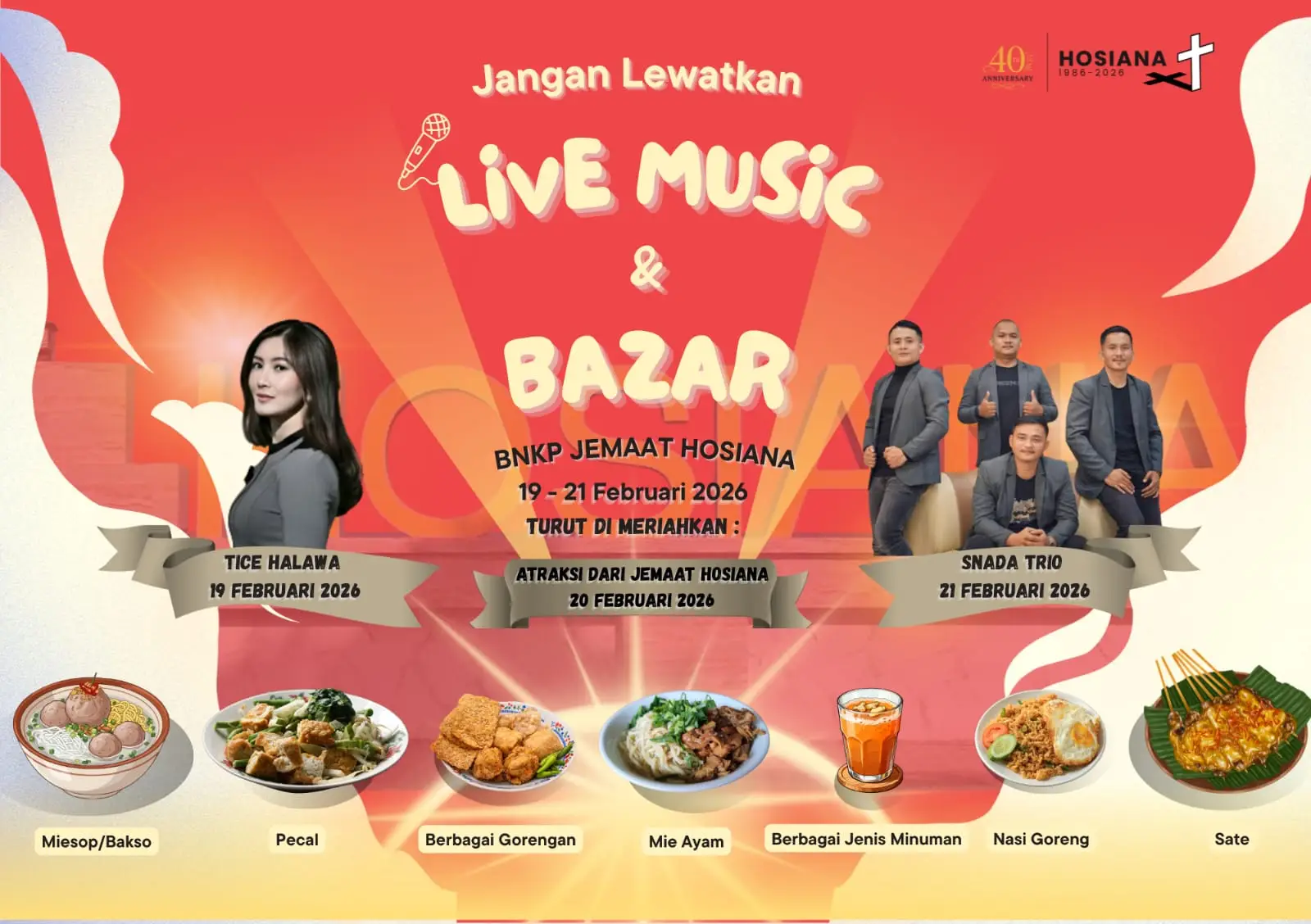 RRI.CO.ID, Gunungsitoli - Dalam rangka Perayaan Ulang Tahun ke-40 dan Pesta Pembangunan Gereja BNKP Jemaat Hosiana Tahun 2026, Panitia Pelaksana mengadakan Bazar dan Live Music bagi masyarakat, yang diselenggarakan mulai tanggal 19 - 21 Februari 2026 di Halaman Gereja Jemaat BNKP Hosiana.