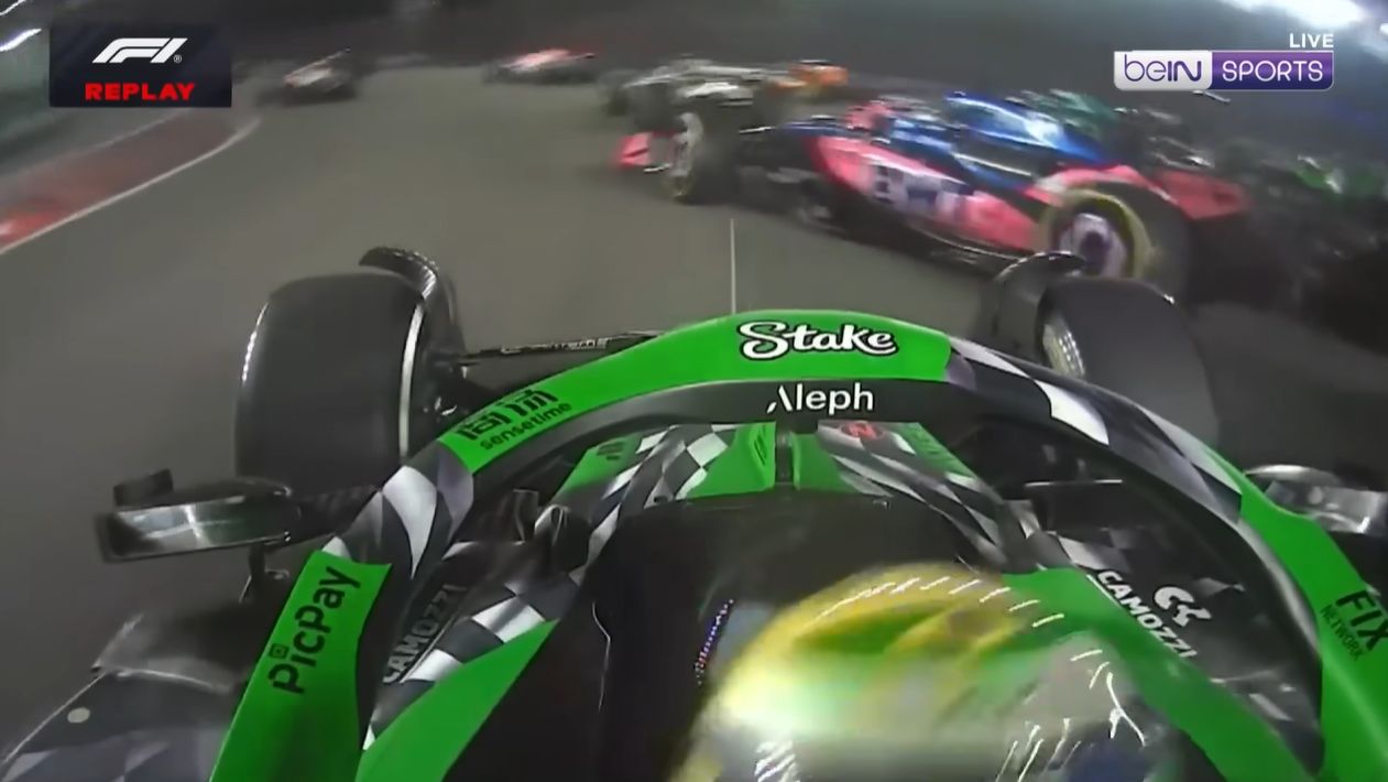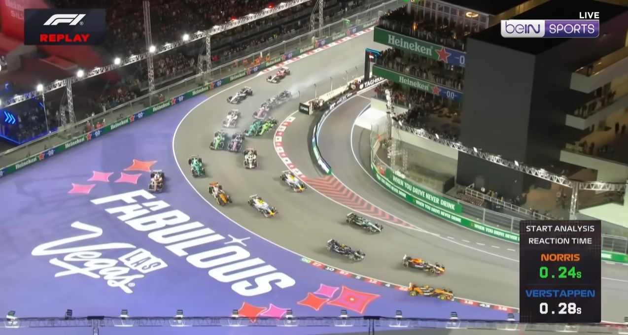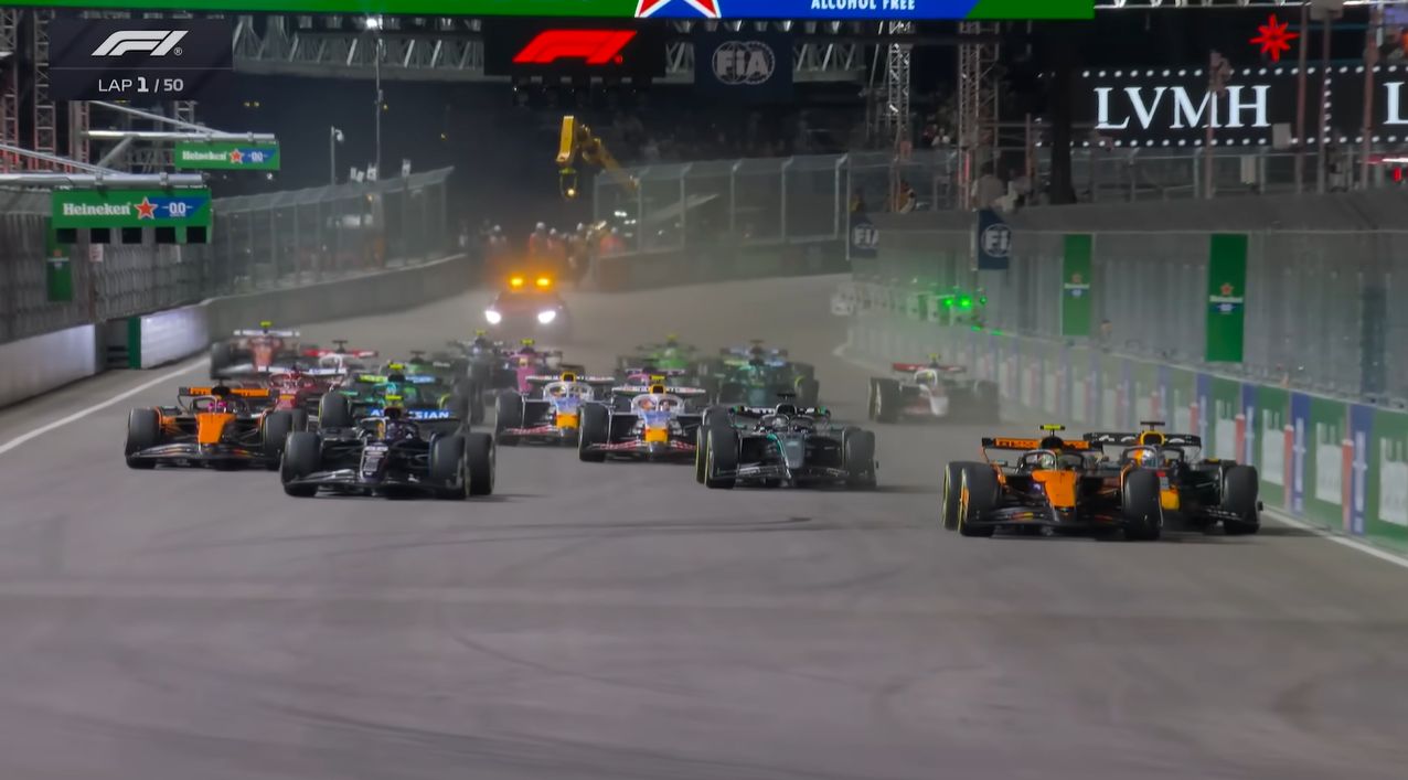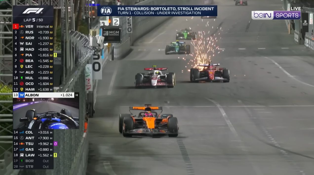 Sementara tiga pembalap terdepan memimpin, kekacauan terjadi di barisan tengah yang berubah menjadi malapetaka di Tikungan 1. Insiden bermula dari pembalap rookie Kick Sauber, Gabriel Bortoleto.