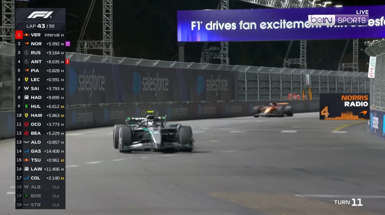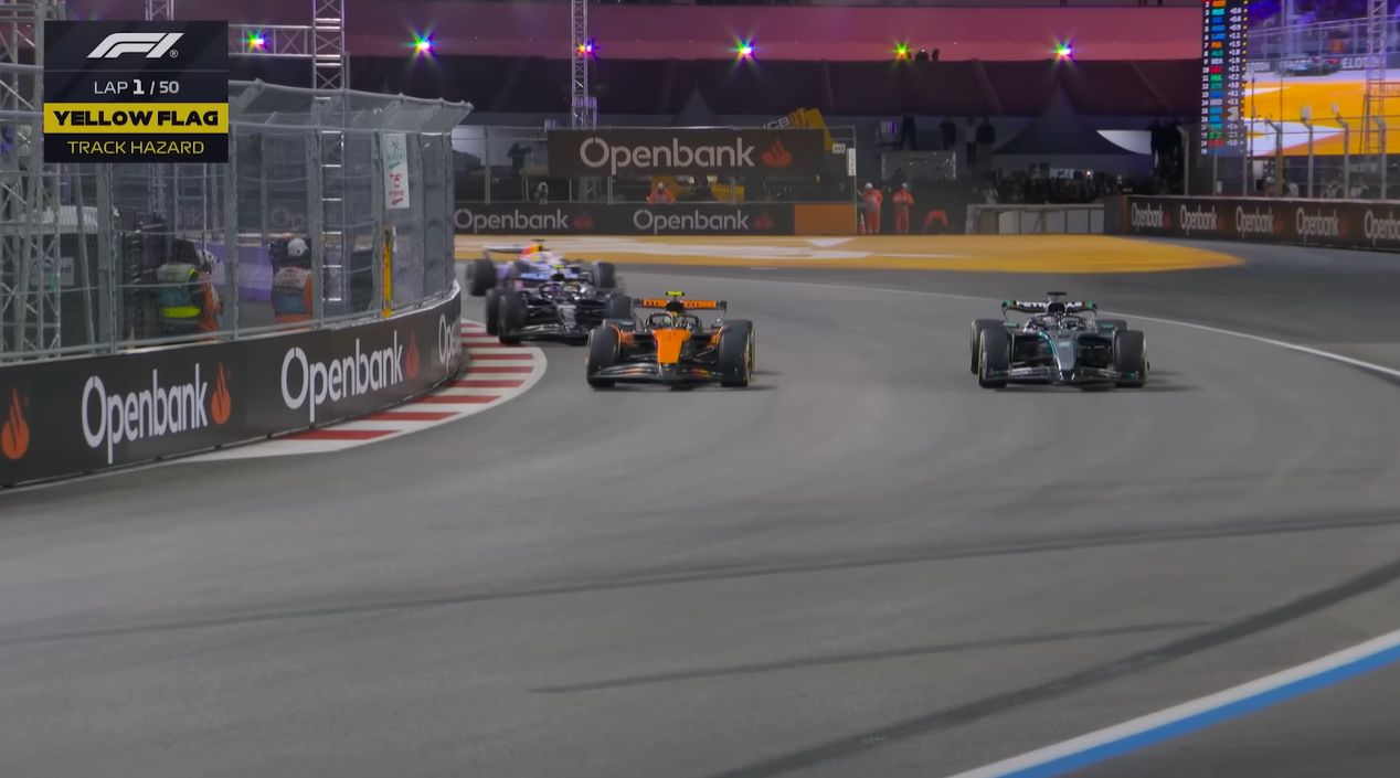 Kemudian, masih dengan lap yang sama, Lando Norris kembali lagi melakukan kesalahan, dimana kesalahannya dimanfaatkan oleh pembalap lain. Tepat di belakang duel Max Verstappen dan Lando Norris, George Russell (Mercedes) yang memulai dari baris kedua, menunjukkan start yang luar biasa agresif. Saat Lando Norris melebar di Tikungan 1, George Russell berhasil menempel ketat di belakangnya. Di sepanjang lintasan lurus pertama pasca-Tikungan 1, George Russell memanfaatkan momentum dan slipstream untuk menantang Lando Norris.