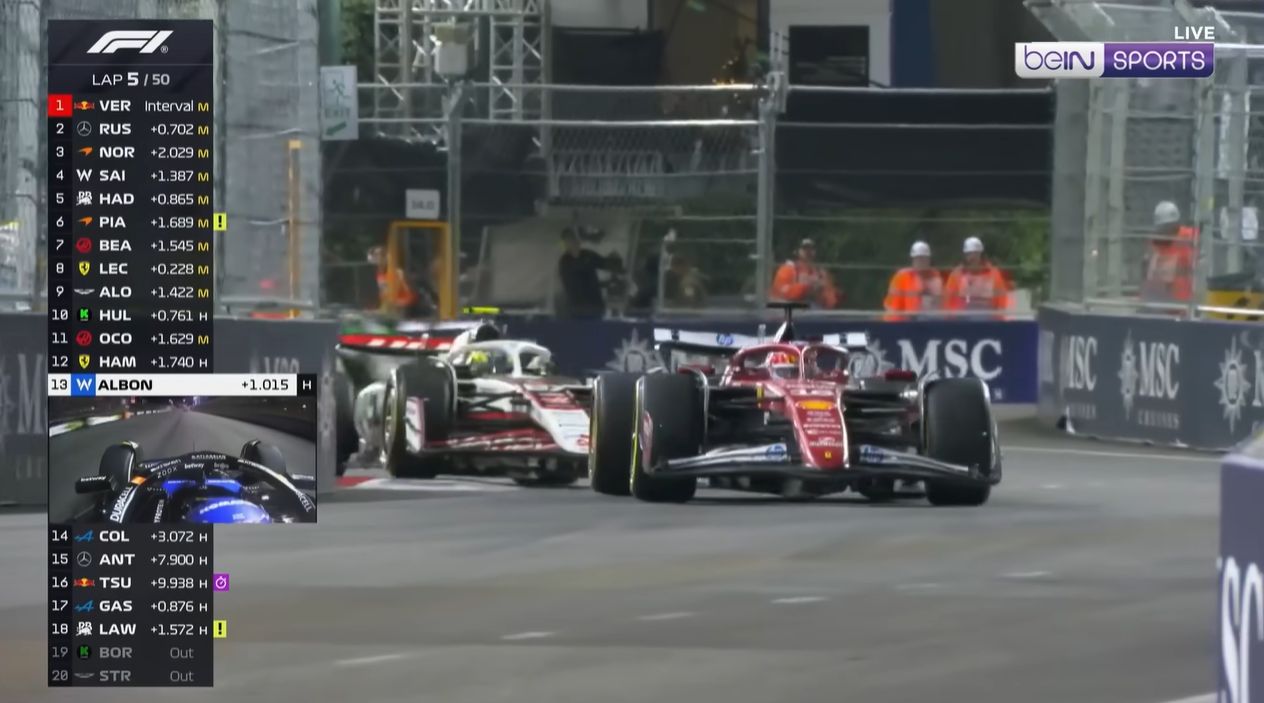 Memasuki pertengahan lomba, nasib sial kembali menghampiri juara dunia tujuh kali, Lewis Hamilton (Scuderia Ferrari). Saat sedang berupaya memperbaiki posisi di sektor kedua, Lewis Hamilton terlibat perebutan jalur yang sengit dengan Alex Albon (Williams Racing).