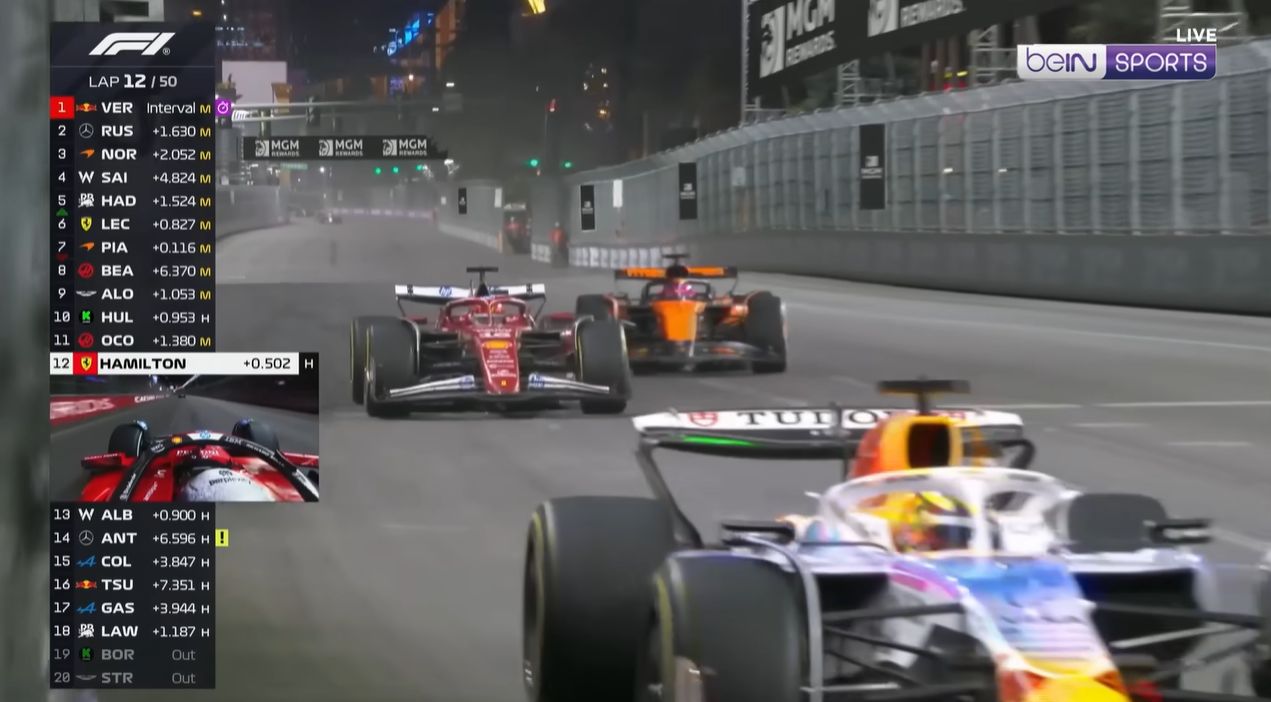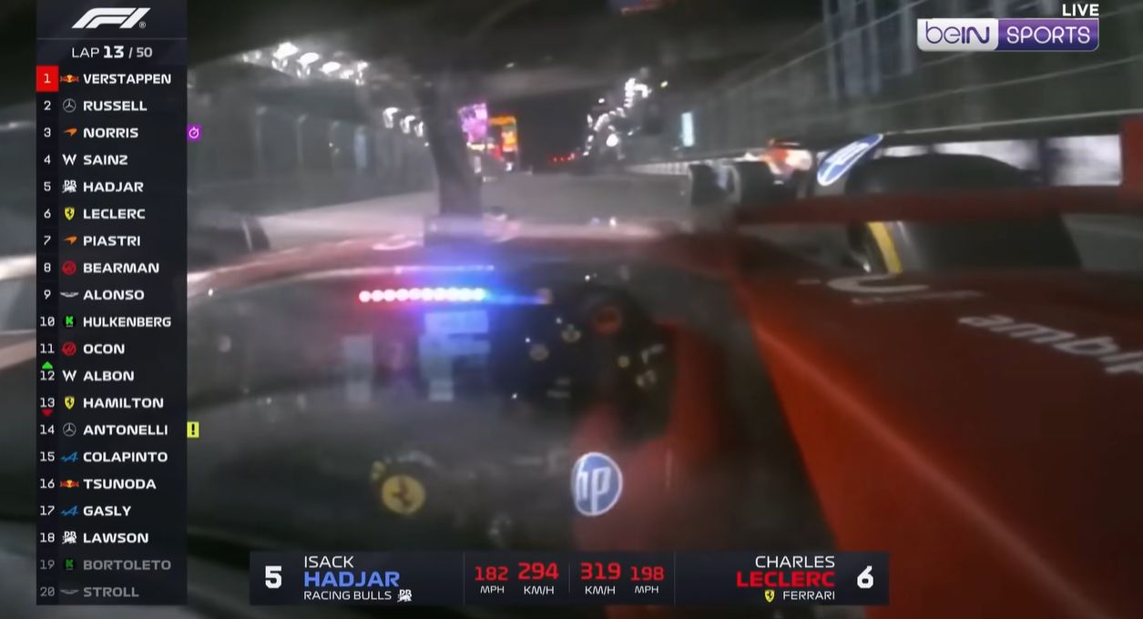 Tak berhenti di situ, Charles Leclerc terus memburu lawan di depannya. Kemudian, aksi terbaik Charles Leclerc terjadi saat ia berhadapan dengan Isack Hadjar (Racing Bull) untuk perebutan posisi 5 (P5). Tanpa bantuan Drag Reduction System (DRS), Charles Leclerc melakukan manuver divebomb yang mengejutkan di Tikungan 14. Ia mengerem jauh lebih lambat dari Isack Hadjar dan berhasil mencuri posisi, sebuah aksi yang membuktikan bahwa Scuderia Ferrari SF-25 masih memiliki taring di lintasan lurus panjang Las Vegas.INSIDEN HAMILTON DENGAN ALEX ALBON