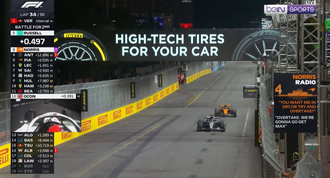 Di lap ke-34 fokus balapan kemudian beralih ke pertarungan Lando Norris untuk merebut kembali posisi kedua. Setelah turun ke P3 di awal lomba, Lando Norris yang membawa misi wajib mempertahankan puncak klasemen, perlahan tapi pasti memangkas jarak dengan George Russell.