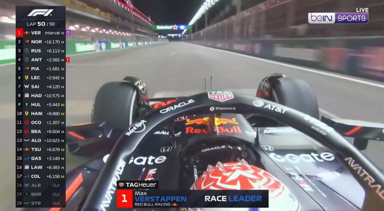 Hingga lap terakhir, Max Verstappen melaju sendirian di depan tanpa ancaman berarti. Pengelolaan ban (tire management) yang sempurna dan strategi pit stop yang mulus dari kru Red Bull Racing membuatnya tak tersentuh.