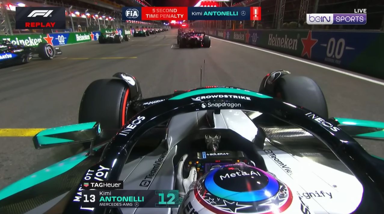 Adapun, di penghujung balapan, FIA juga mengeluarkan keputusan penting terkait insiden di awal lomba. Pembalap rookie Mercedes, Kimi Antonelli, terbukti melakukan jump start (bergerak sedikit mendahului sinyal lampu start). Akibatnya, ia dikenakan penalti waktu 5 detik.