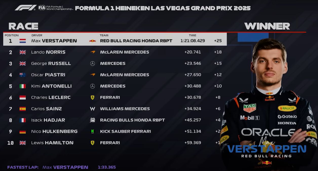 Ia melintasi garis finish sebagai juara GP Las Vegas 2025 atau sebagai Podium 1 (P1) , sebuah kemenangan dominan yang mengingatkan kembali pada performa superiornya di awal musim. Kemenangan ini sekaligus menjadi "balas dendam" manis setelah kesulitan teknis yang ia alami di seri Brazil sebelumnya.KeEPUTUSAN KONTROVERSIAL : DISKUALIFIKASI DUO MCLAREN