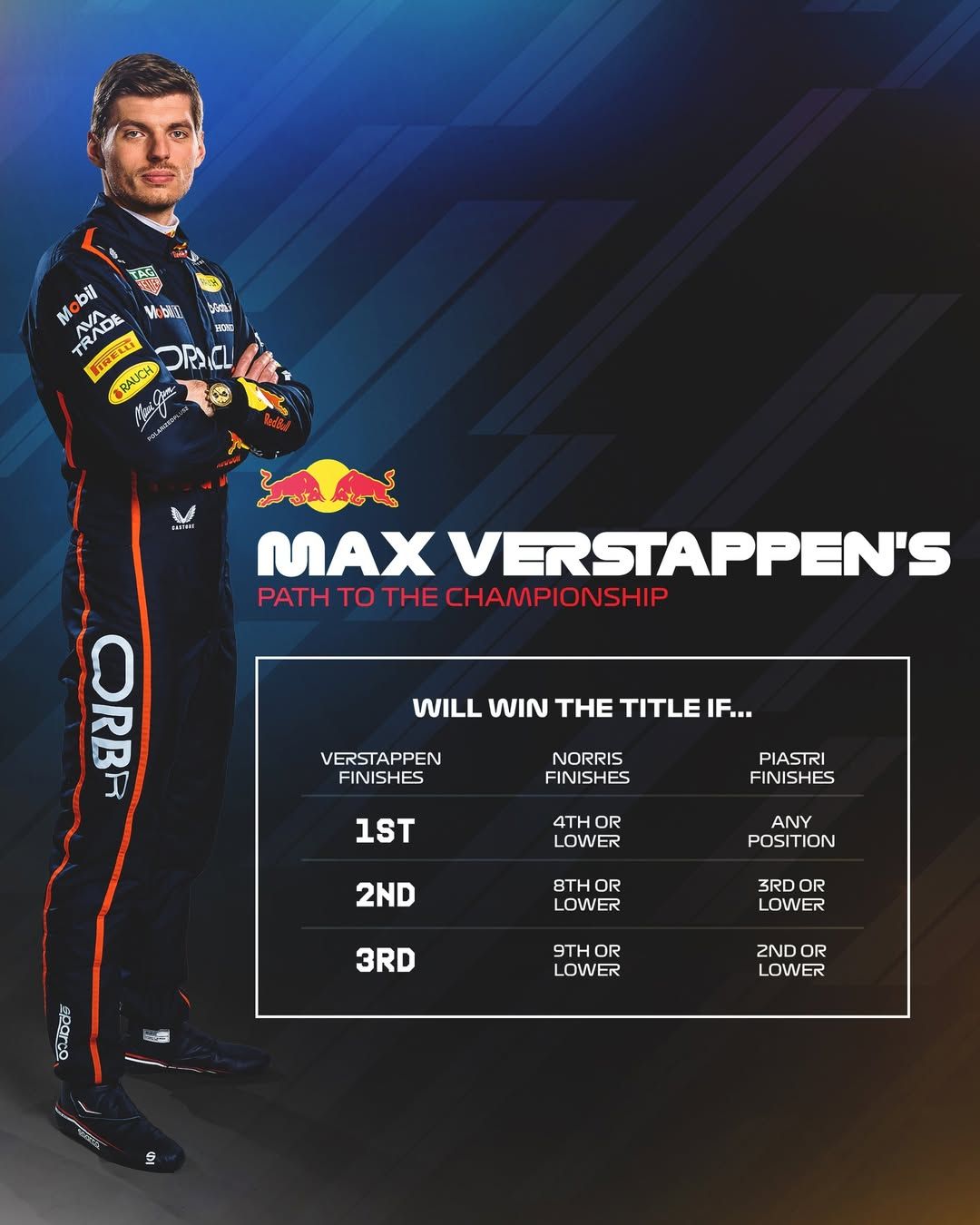 Bagi Max Verstappen, syarat untuk merebut gelar jauh lebih berat. Ia harus finis minimal di posisi pertama atau kedua, dan pada saat yang sama berharap Lando Norris gagal tampil kompetitif. Max Verstappen akan menjadi juara jika Lando Norris finish posisi keempat (P4) atau lebih rendah, selama ia sendiri memenangkan balapan.