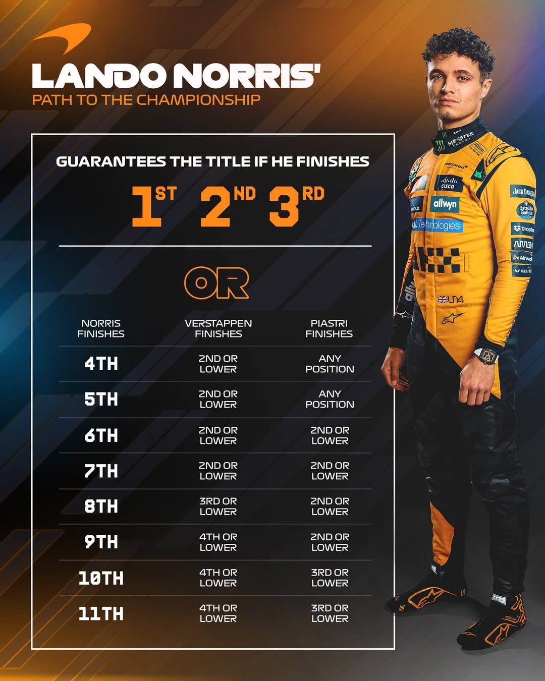Kemenangan Max Verstappen di Qatar membuat peluangnya tetap terbuka, sementara Oscar Piastri masih berada cukup dekat dalam perburuan. Namun, Lando Norris memasuki Abu Dhabi dengan posisi yang paling menguntungkan, karena pembalap McLaren itu hanya perlu finish di podium (P1) untuk memastikan gelar juara dunia pertamanya.SKENARIO LANDO NORRIS MENJADI JUARA DUNIA