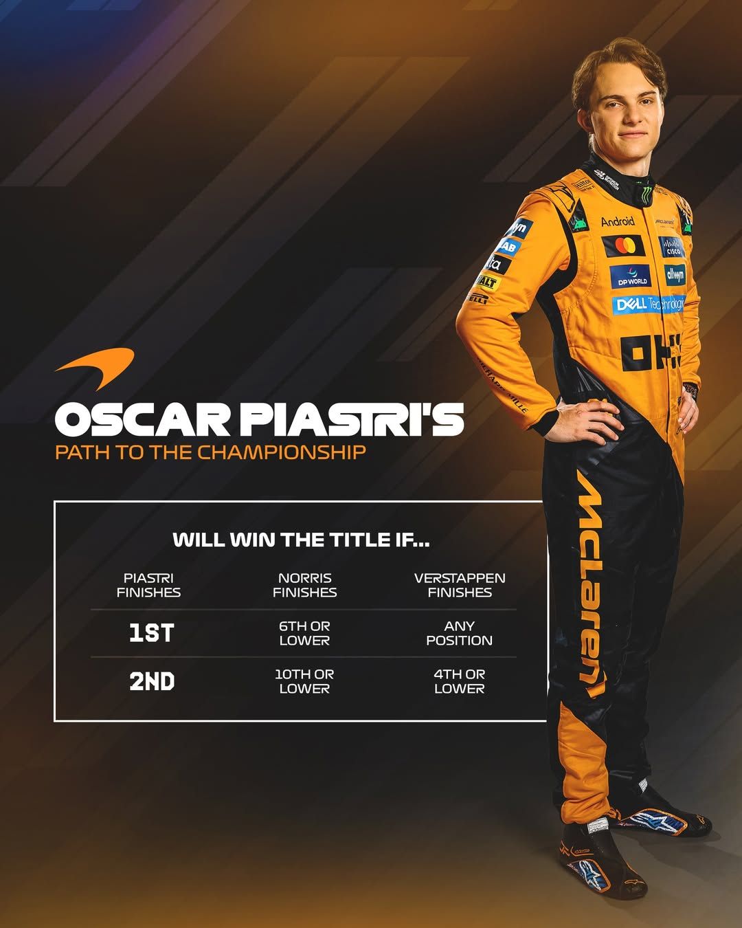 Oscar Piastri memiliki peluang, meski tipis. Syaratnya jelas: ia harus menang di Abu Dhabi, sambil berharap dua rivalnya berada jauh di belakang. Oscar Piastri akan menjadi juara jika ia memenangi balapan dan Lando Norris gagal mencapai posisi keenam (P6) atau lebih baik.