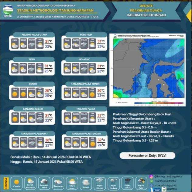 RRI.CO.ID, Malinau : Prakiraan cuaca wilayah Kalimantan Utara di Rilis Badan Meteorologi, Klimatologi, dan Geofisika (BMKG) Stasiun Meteorologi Tanjung Harapan, yang disampaikan oleh Froncester Khafidzo Rakmah, berlaku mulai Rabu, 14 Januari 2026 pukul 08.00 WITA hingga Kamis, 15 Januari 2026 pukul 08.00 WITA.