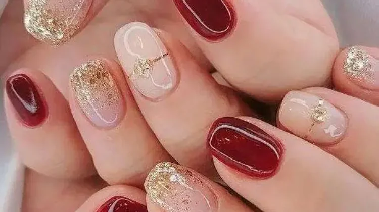 Last but not least, nail art ini menggabungkan warna maroon dengan aksen kuku bernuansa nude, yang dihiasi serpihan emas yang menambah kesan elegan serta berdimensi.