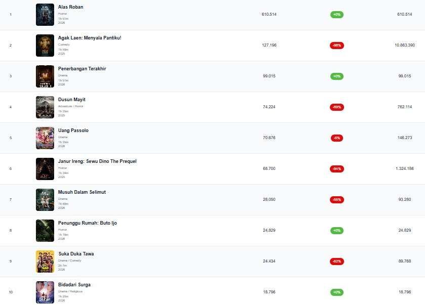 Menurut data web Cinepoint periode 12 hingga 18 Januari 2026, pada peringkat pertama pekan ini ditempati film bergenre horor dengan judul Alas Roban. Film yang mengangkat cerita salah satu jalur angker yang sering dilewati bus di rute Jawa ini pada pekan pertamanya setelah rilis 15 Januari, meraih jumlah penonton sebanyak 610.514 orang.