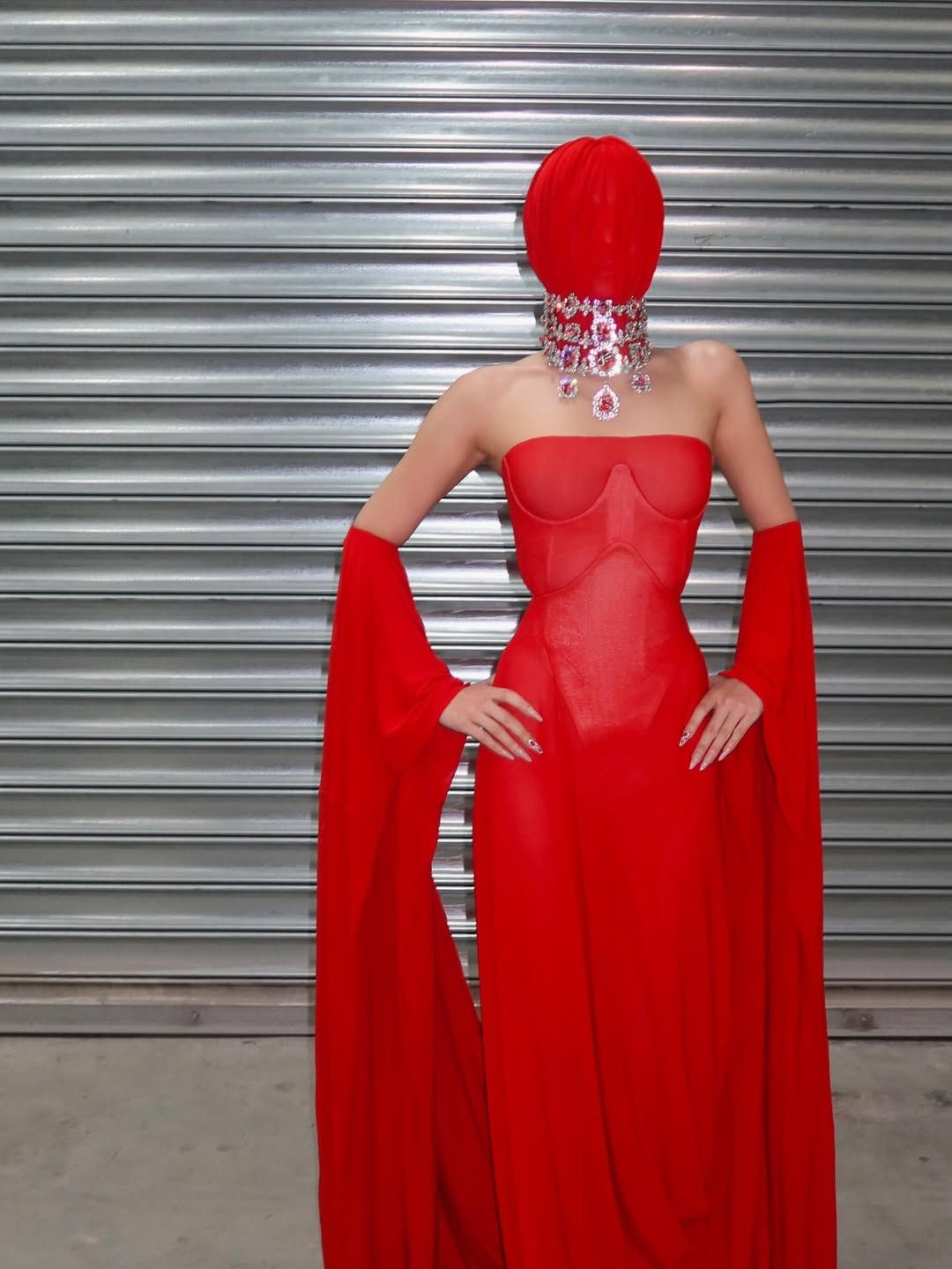 avant-garde yang sebelumnya dikenakan Kim Kardashian dalam warna krem pada Academy Museum Gala di Los Angeles, Oktober 2025.Meski mengenakan rancangan yang sama, gaya yang ditampilkan keduanya terlihat berbeda. Kim Kardashian memilih mengikuti konsep